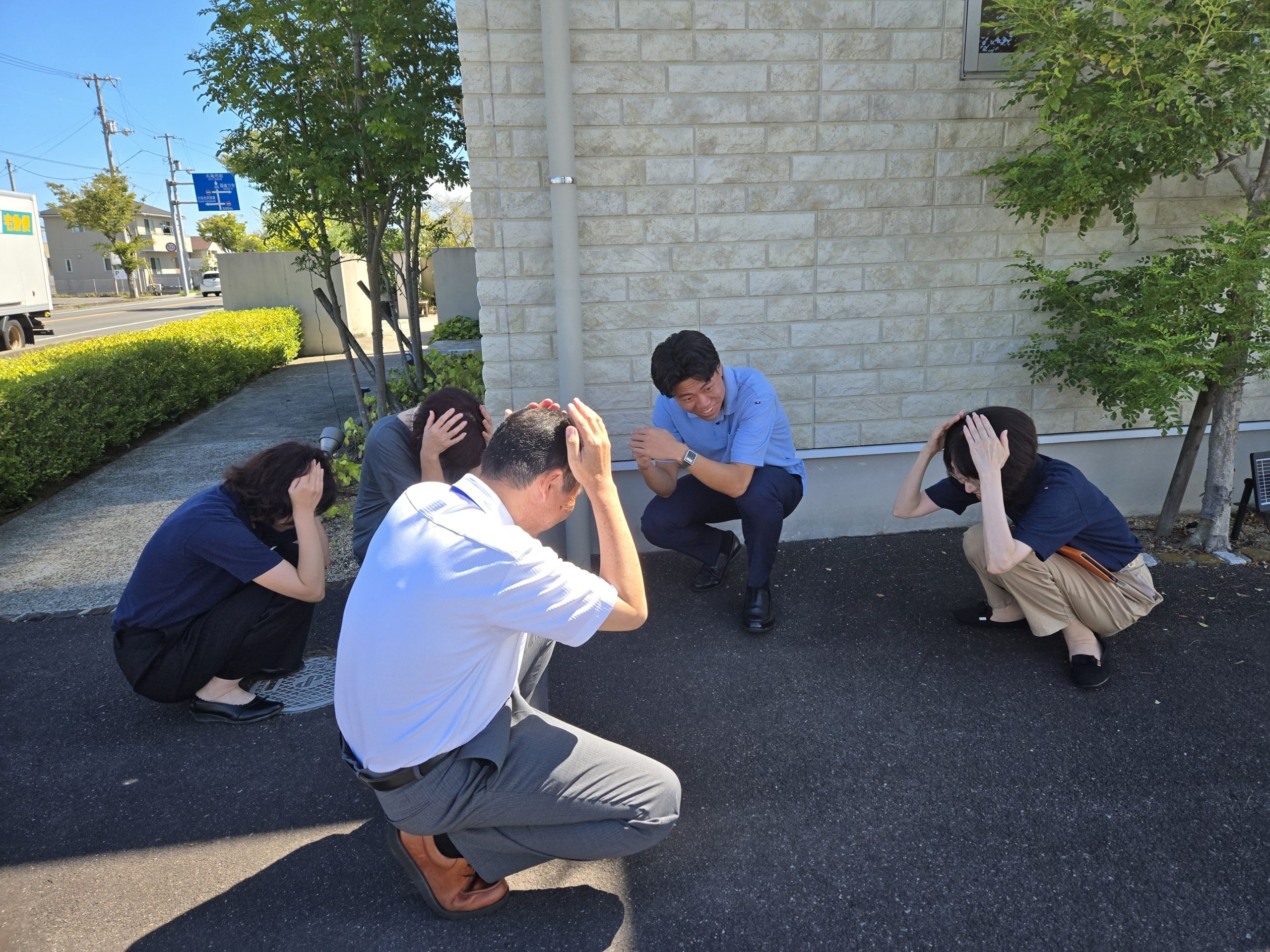 地震がきたことを想定し、それぞれ机の下に隠れ、揺れが収まったところで外へ避難。